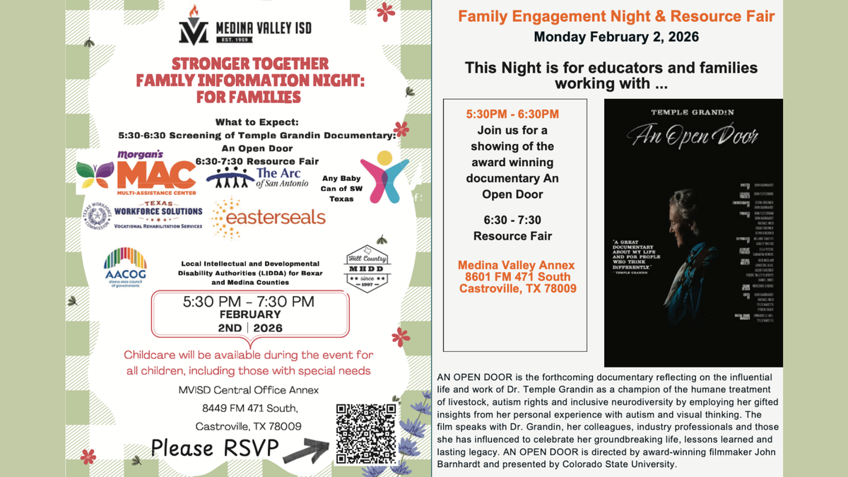 You’re invited! Stronger Together: Family Information Night & Resource Fair on Monday, February 2, 2026, from 5:30–7:30 PM at the MVISD Central Office Annex (8449 FM 471 South, Castroville).